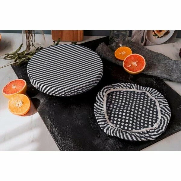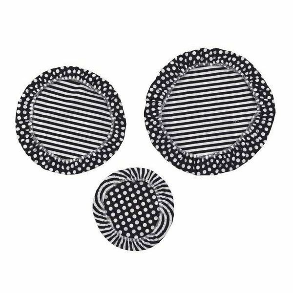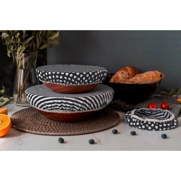 In diesem Set sind 3 gemusterte, schwarz/weiße Bauwollabdeckungen in verschiedenen Größen enthalten. Die Abdeckungen sind ungewachst, waschbar, biologisch, 100% natürlich aus Baumwolle und plastikfrei. Sie kommen in den Durchmessern 20 cm, 25 cm und 30 cm und sind somit perfekt geeignet um Schüsseln mit Essen zu tranportieren oder vor Tieren zu schützen.
